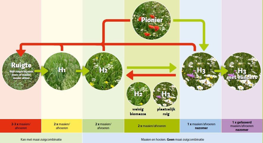 Wat maaien we wel of niet? We maaien de grote delen van grassen en brandnetels eruit. De bloemrijke delen van een vlak blijven gehandhaafd met uitzondering van die delen waar weinig verschil is in soortenrijkdom is. Door het maaien van deze delen wordt de “ruigte” eruit gemaaid en vindt verarming plaats. Hierdoor kunnen op termijn andere soorten zich vestigen. Dit zijn merendeels de soorten welke meer beleving bieden door bv. bloeikleur.